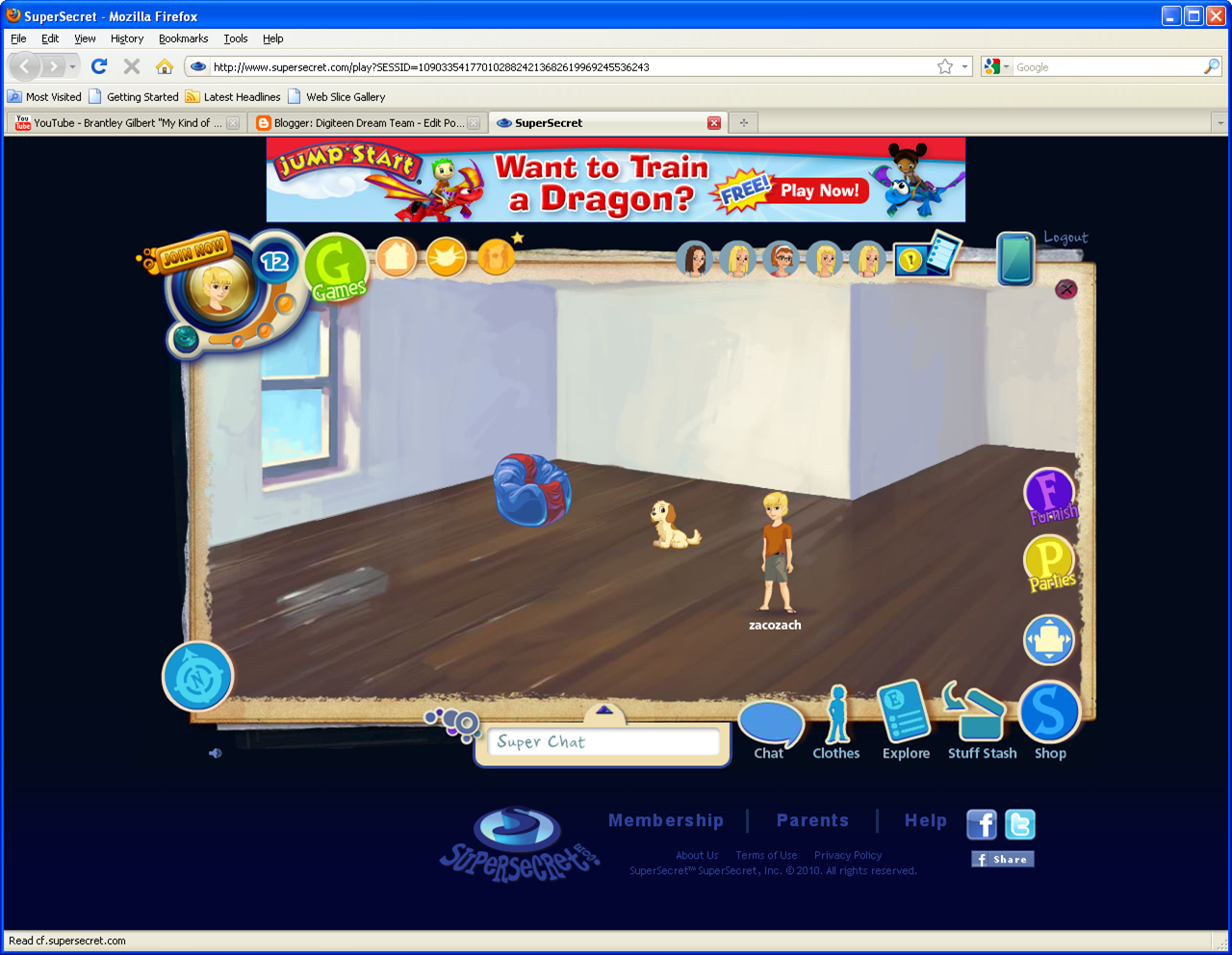 Super secret is a free Virtual world for teens the game is very fun and very safe. The Virtual world also has a chat that filters bad words and private questions. You can meet people from all around the world and play game to get your age higher. Right now I am only thirteen on the world. This world is really fun.